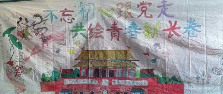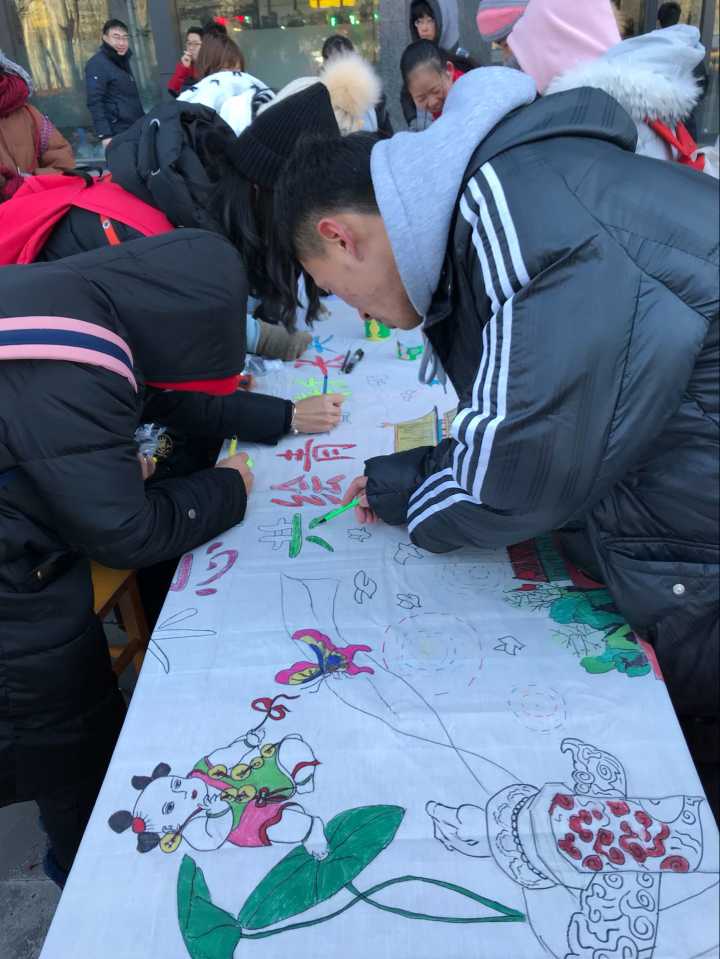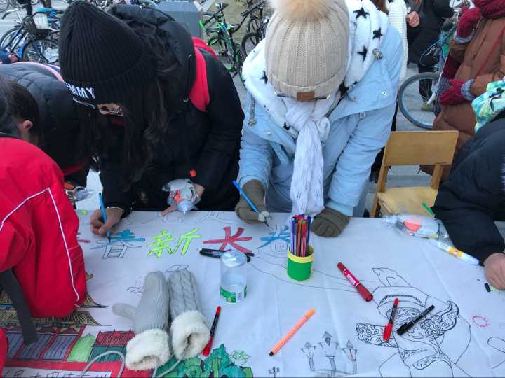 在北方寒冬的狂风呼啸中,工作人员搬来了一张张桌子,利用夹子和十字钉固定住了画卷,努力吸引着来往的学生。针对许多在路边观看活动的同学,工作人员热情积极地为过往的人员介绍本次活动,吸引他们在长卷上绘画涂色,留下自己对党的美好愿景,引导他们顺利地完成了绘制工作。即使天气很寒冷,也抵挡不住同学们的热情。画技高超的同学为洁白的长卷绘上了庄严的天安门、一只只飞舞的白鸽、一面面飞扬着的红旗......具有书法功底的同学写下了一句句对于党和祖国的美好祝福......而其他同学也都积极地为画卷上色。天气严寒,不少同学冻的手通红,工作人员也贴心地给大家准备了热水和暖手袋。