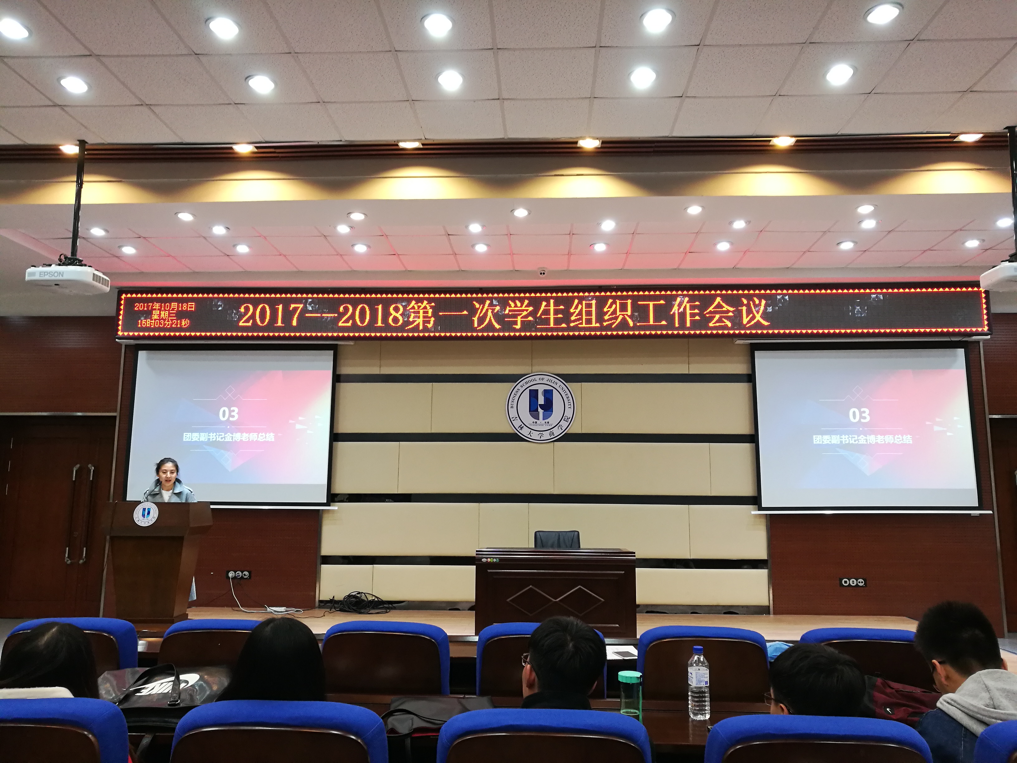 会议第三项,由团委负责人金博老师进行会议总结。金老师提出,学生四大组织是一个充满活力、青春向上的组织,作为学生干部,我们不能以个人为中心,而是要以学生组织、学院、学校甚至国家为中心,要身兼责任、勇于担当。同时要在保证学习质量的基础上更多地为同学们服务,将学生工作做实做好。
