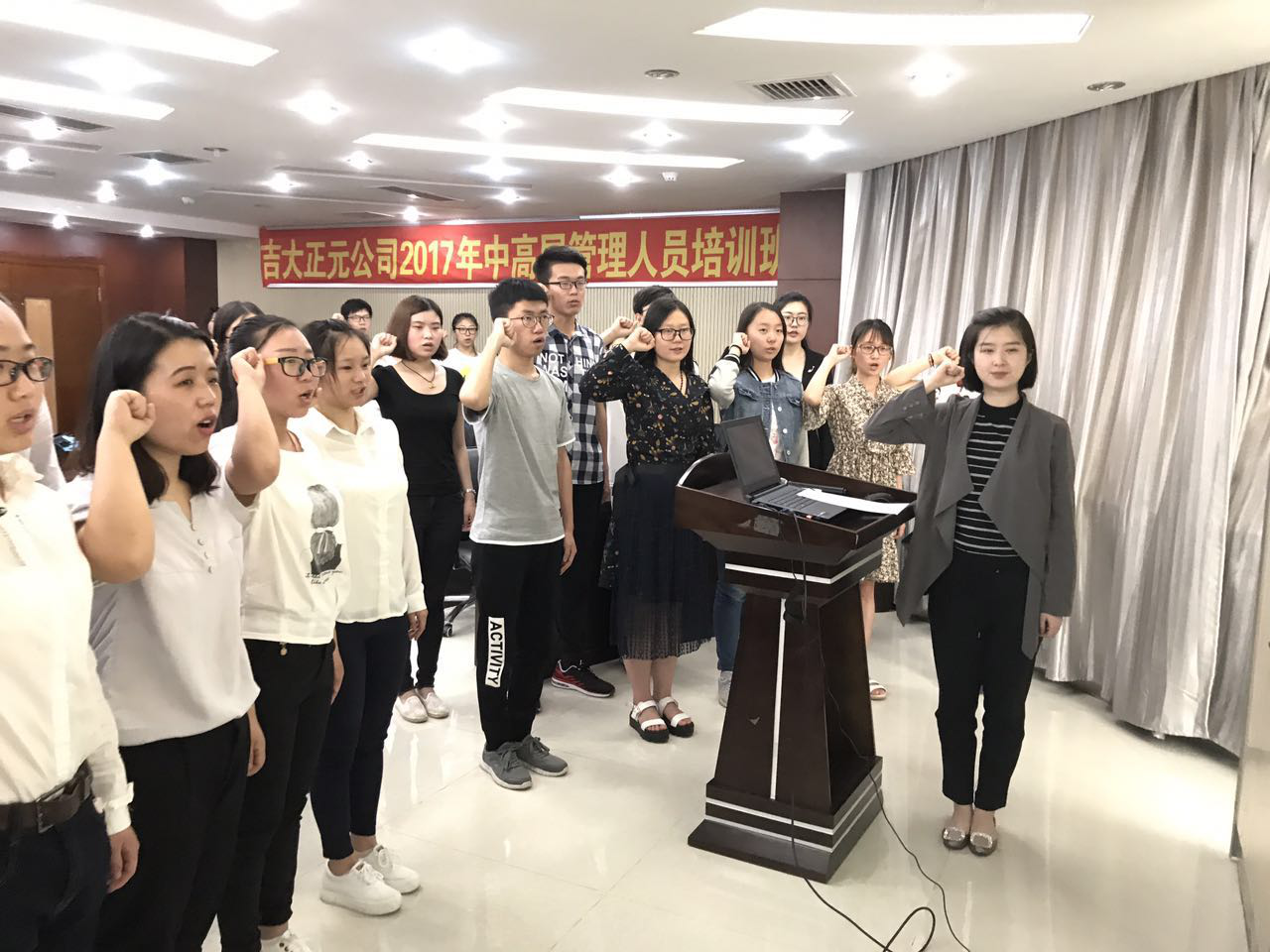 在甄老师的带领下,28名新发展党员和22名老党员右手握拳举过肩头,面向鲜红的党旗庄严宣誓。