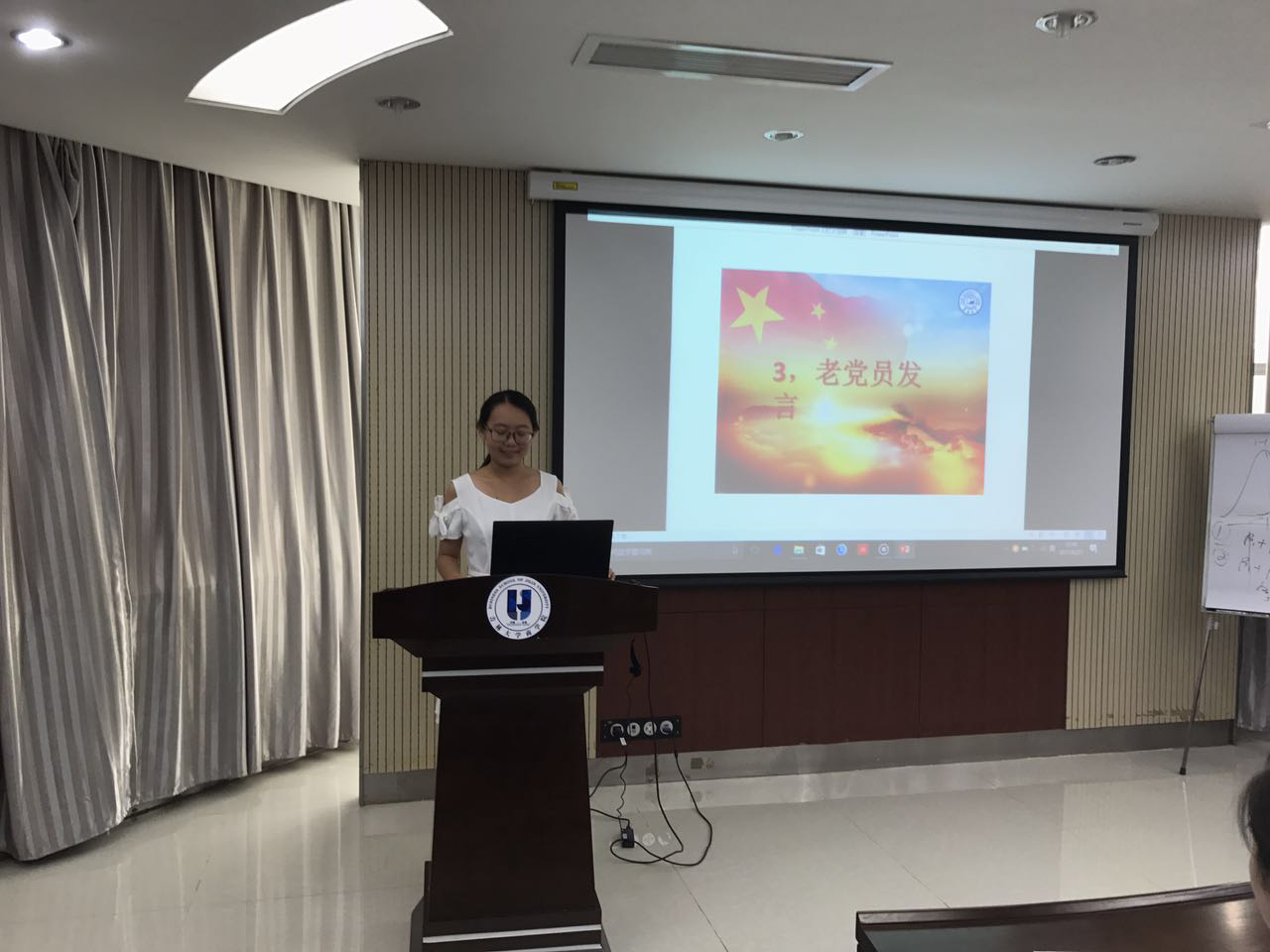大会第三项,由胡禹竹同学代表各位老党员发言。她表示,风雨共济的九十年是中国共产党从诞生到成熟的发展时期,一页页一幕幕都是中华民族上下求索艰苦奋斗的心路历程。这个党,这个民族,这个国家,每一次成长都伴随着分娩的痛楚,回首这段风云激荡的岁月,历史长河中流淌的是勇敢的弄潮儿——中国共产党——引领中国人民谱写的雄壮之歌。对于党员而言,誓词不仅仅是一个记忆,更是时时刻刻严格要求自己的标准。“夫以铜为镜,可以正衣冠;以古为镜,可以知兴替;以人为镜,可以明得失”。虽然知易行难,但我们既然选择便应义无反顾。即使一时做不到,也要不断努力地向目标靠近。