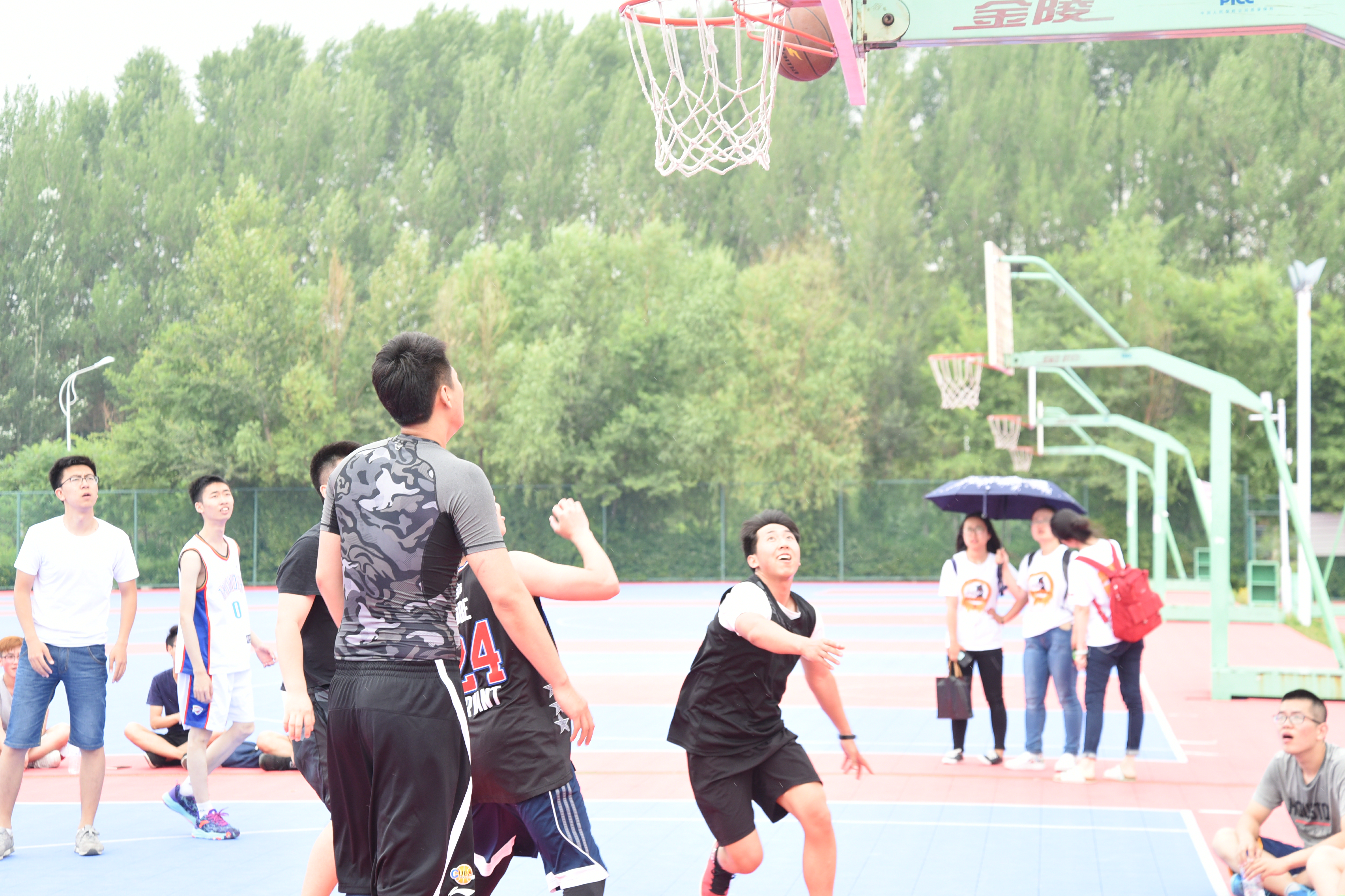 时间飞逝,上半场结束。金老师和啦啦队成员为球员们准备了水,大家有说有笑、互相开着玩笑,闷热的空气中夹杂着点点雨丝,但大家依旧激情不减,休息了一会就开始了下半场的角逐。下半场,球员们的体力有些不支,但却充分地展现了投篮的水平。一个又一个的三分球引得场下阵阵欢呼。比赛将近结束,两队打成平局,进行了加时赛。最终,比赛以80:75的比分顺利结束本次比赛。