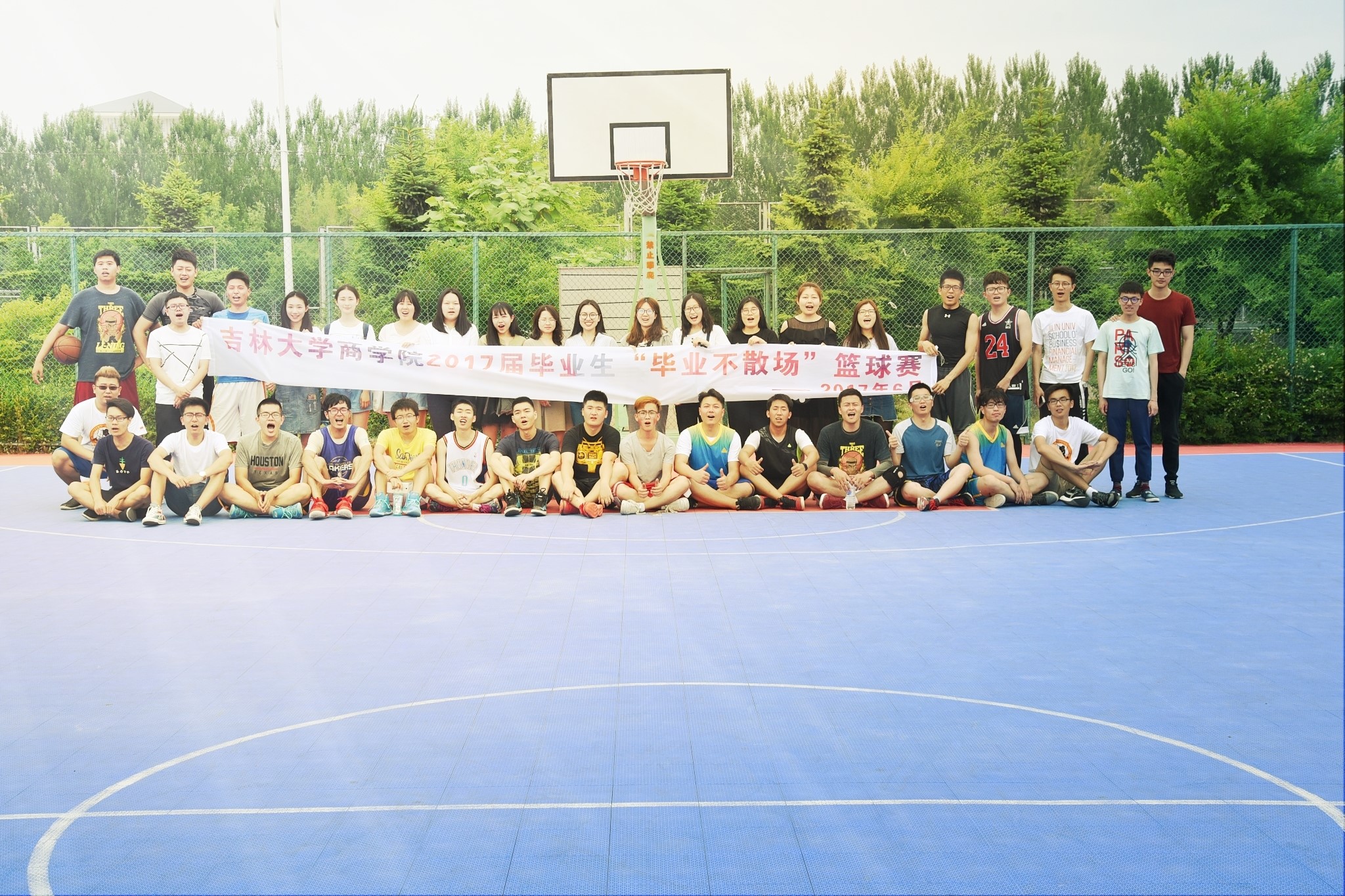 6月17日9:00,304am永利集团官网2017届各班男生代表于304am永利集团官网篮球场进行了“毕业不散场”主题篮球友谊赛,2017届辅导员金博老师与2017届部分同学到场加油助威。