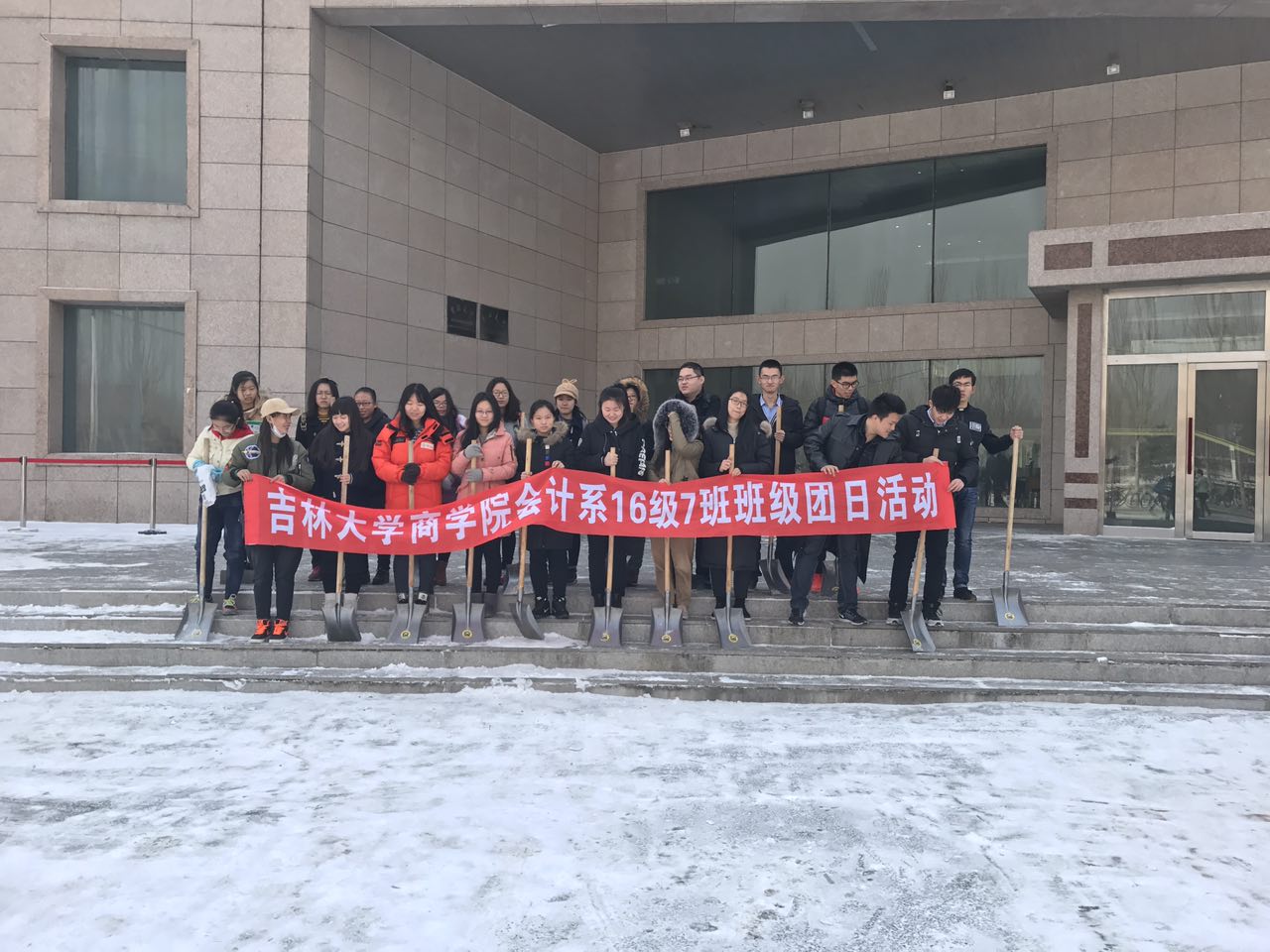 活动的最后,同学们整齐有序的将铲雪工具交还仓库,并在工作成果前合影留念。