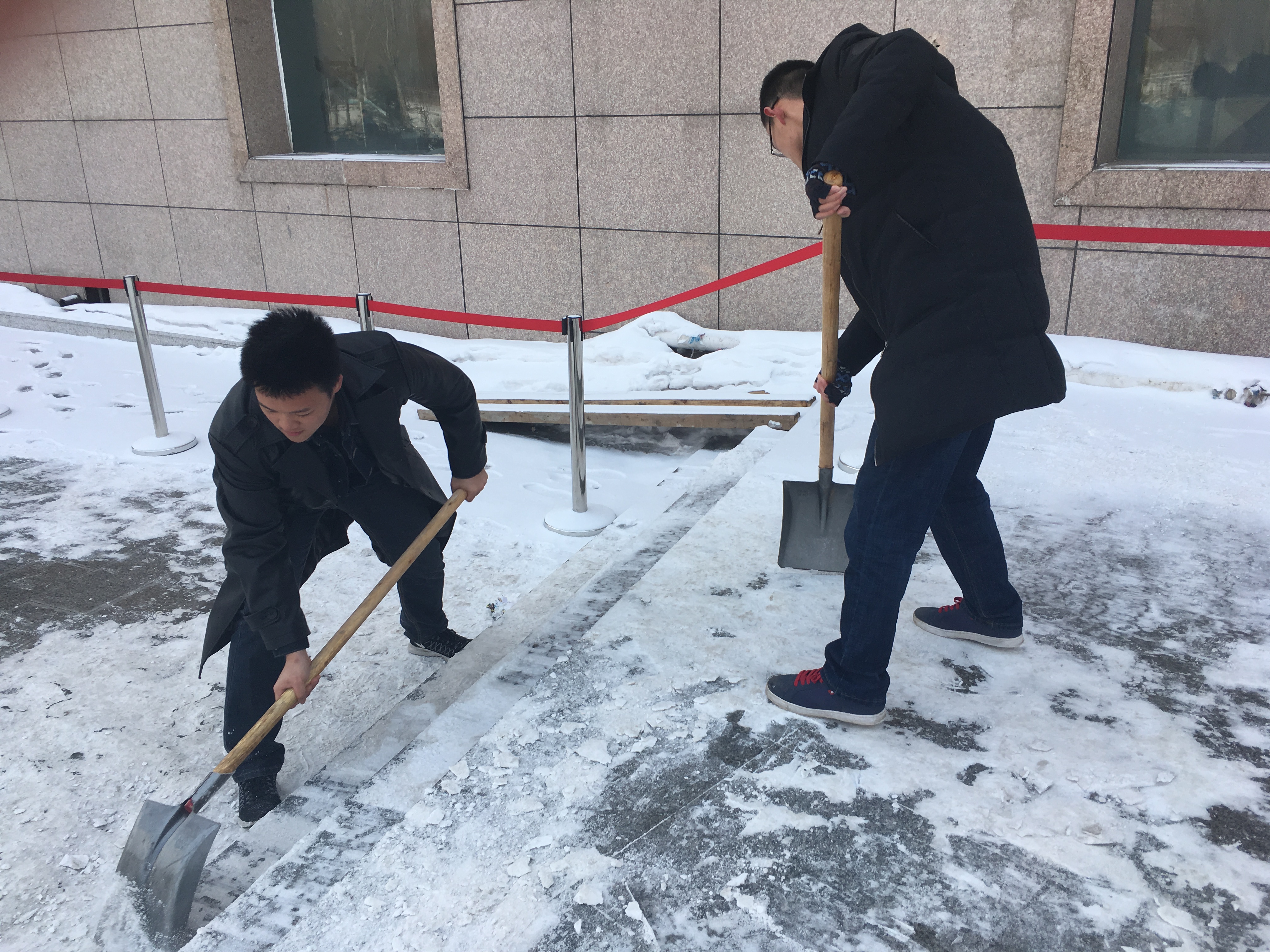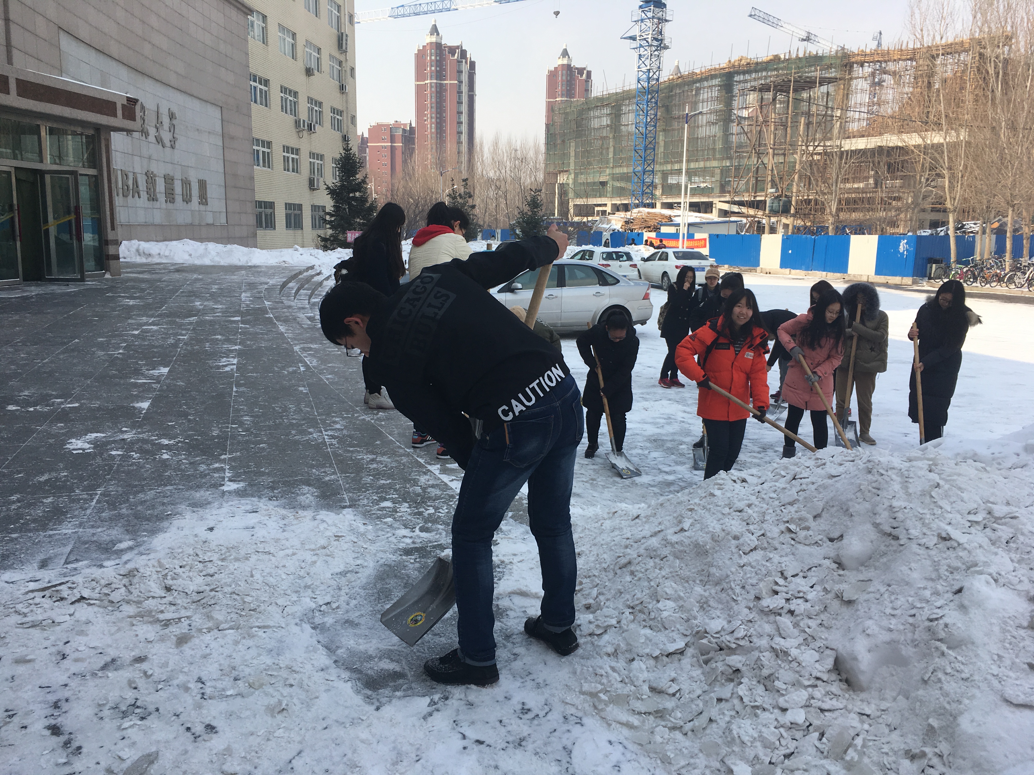 随着清雪活动的开展与深入,同学们不惧凛冽寒风,满怀干劲地投入到铲雪活动中,有的同学尽管手和脸被冻得通红,但还是坚持扫清路上的积雪。道路上的积雪由于已经被踩踏过,变得十分紧实,使得道路清扫工作变得愈加困难。但为了方便人们的出行,同学们都十分积极地投入到铲雪活动当中。