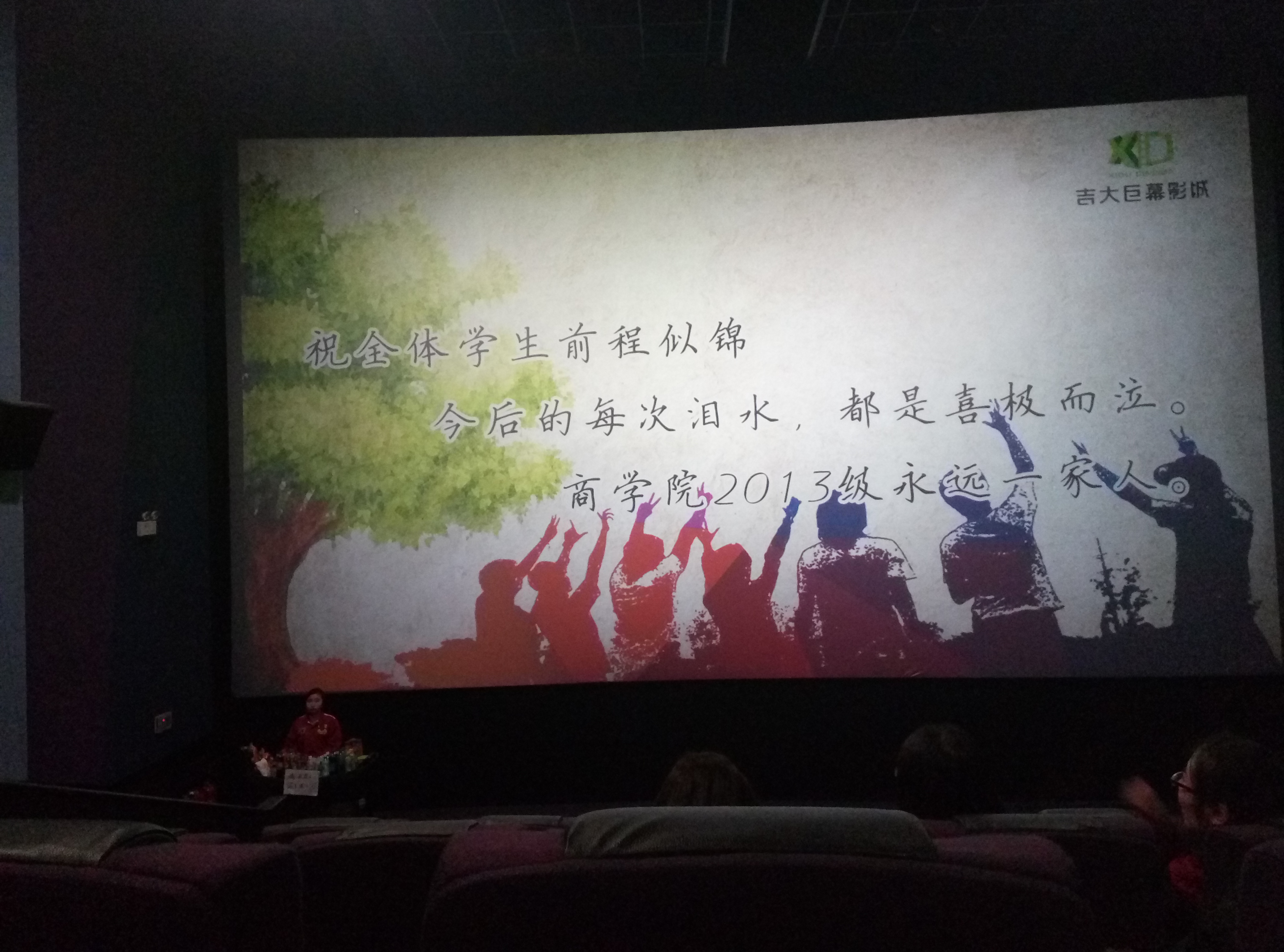 下午4时许,同学们在金博老师的带领下,来到吉大巨幕影城观看抗日题材电影《铁道飞虎》,本次集体活动也是金博老师代表学院对刚刚在考研战场征战的同学们的关怀和慰问。同学们也感受到了304am永利集团官网这个大家庭中温暖的氛围,大家都是早早的到场,一边谈笑,一边等待。之所以观看抗日题材的电影,更是为了给即将踏入社会的同学们一份勉励,勿忘国耻,鼓励他们在踏入社会后积极奉献,爱岗敬业,为社会做出自己的一份贡献。简单的一部电影却承载着老师对学生们的良苦用心和谆谆教导。电影结束后,屏幕上出现“祝同学们前程似锦,愿以后的每次泪水都是喜极而泣,304am永利集团官网2013级永远一家人”的字样,同学们都深深地被感动,即将分别的伤感和温暖的家庭氛围充满了剧场。