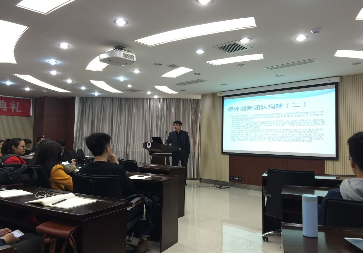 会议上,邹教授对有关课外培养的内容以及学分设置进行了详细的解释。他首先简单为我们介绍了一些国外知名大学对大学生课外培养方面的活动设置。强调了课外培养对当代大学生的重要意义。随后,他对各项活动的学分分配以及如何评定做了细致的解释,鼓励大家积极参加学术活动、文体活动以及社团活动等课外培养活动,同学们受益匪浅。
