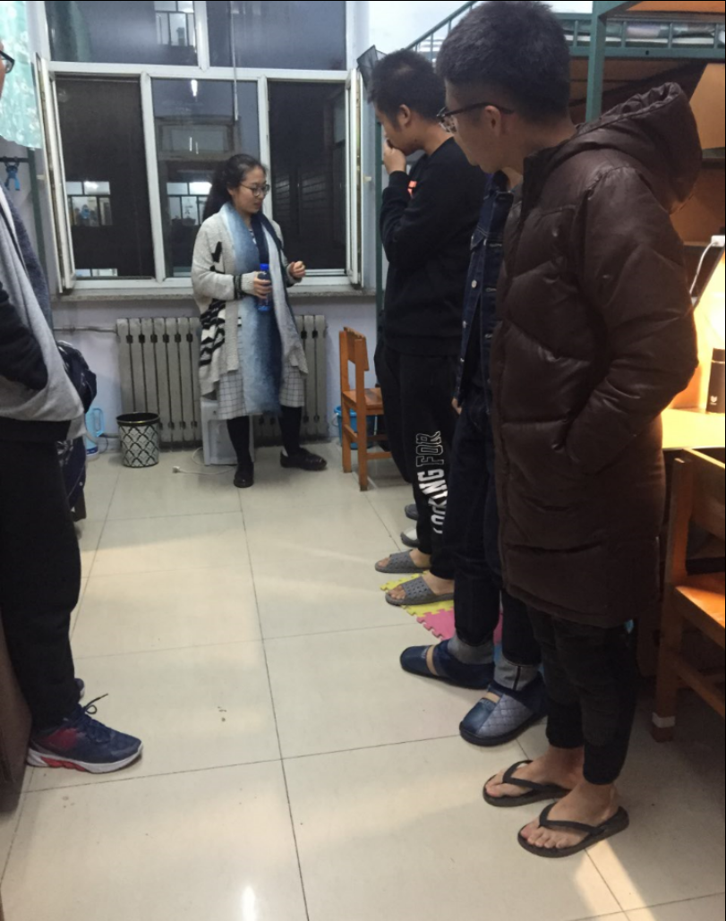 金老师和生活部的学长学姐首先检查了女寝,其后再检查男寝的宿舍情况男寝。整体来说女寝的整洁度更高也更有条理性,男寝虽然做过一定的清扫,但整理工作并未到位,例如衣服挂在床边,垃圾桶过满等现象仍然存在。由此可见,寝室的整洁与卫生并不是一次清扫便可以一劳永逸的,我们应该时刻爱护自己的寝室,做到勤打扫勤整理。