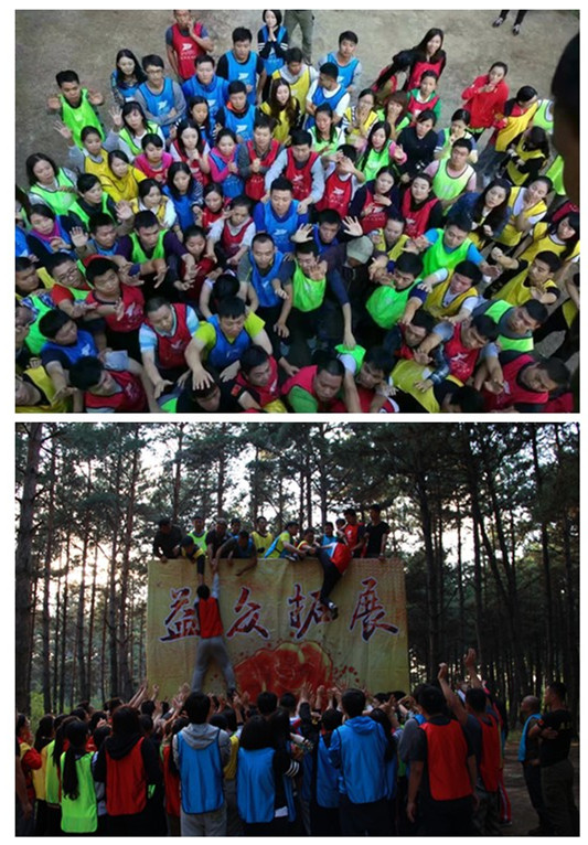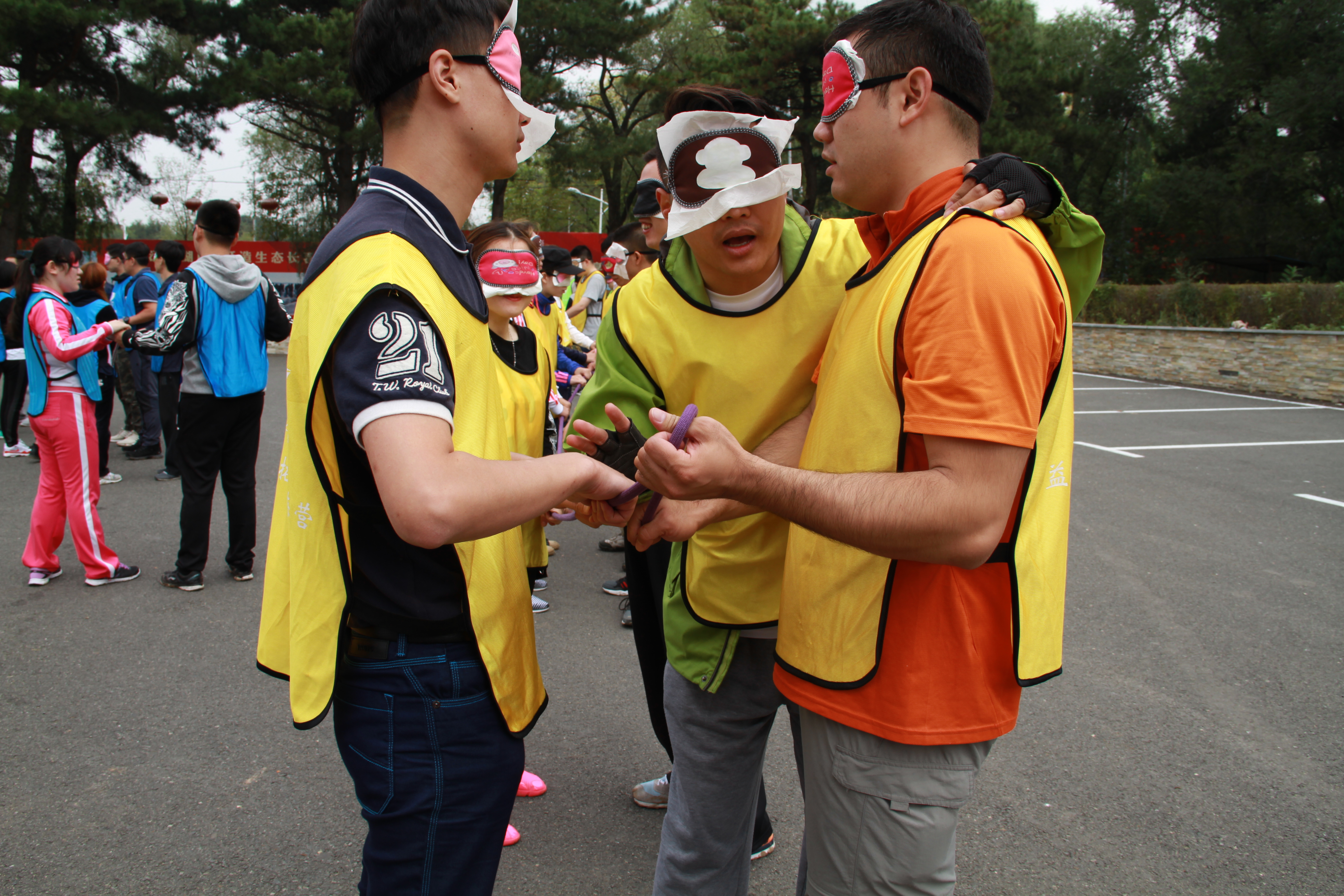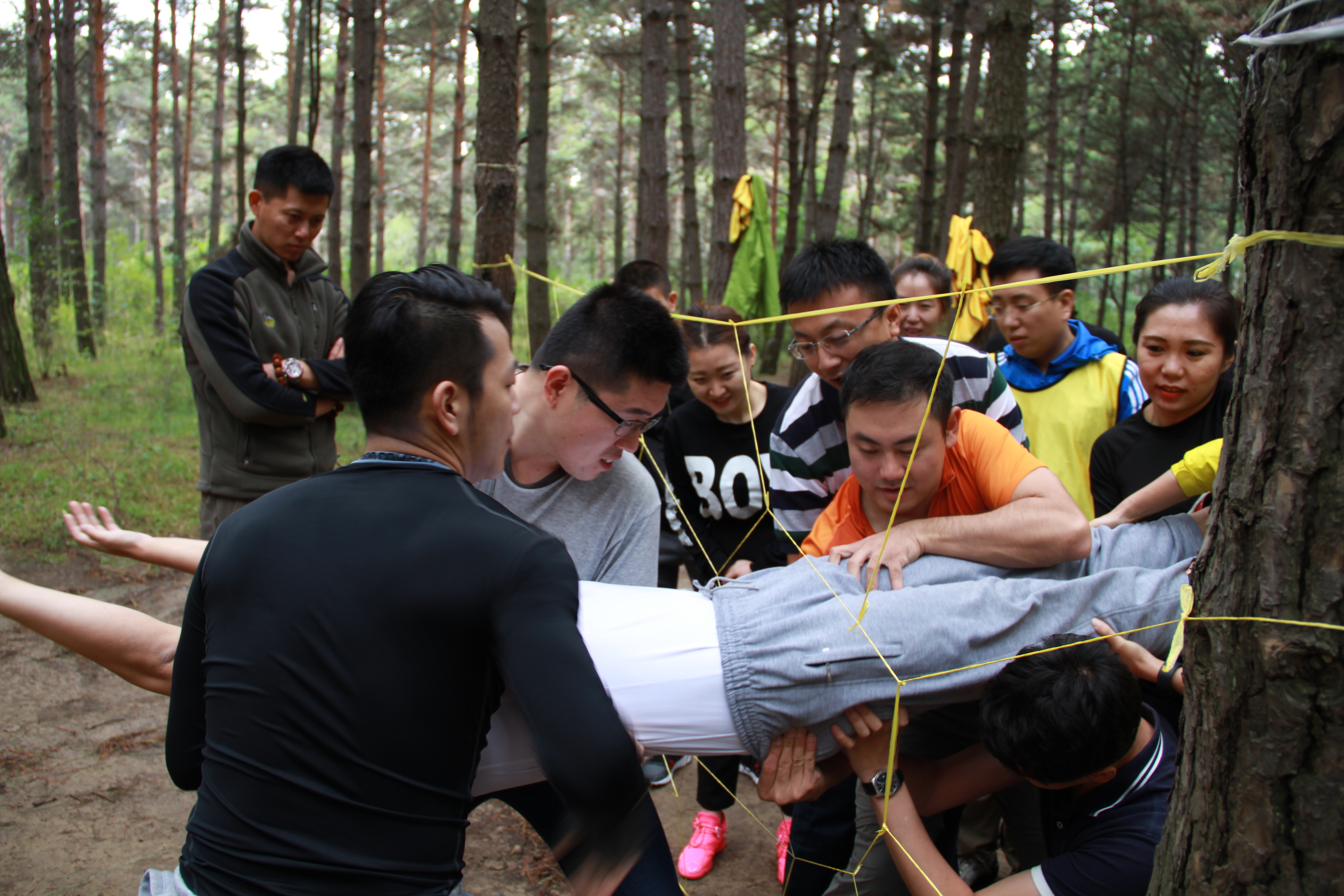 盲人方阵 全体成员在蒙住双眼的情况下,在规定时间内将一条绳子围成一个面积最大化的正方形。通过此项目,学会在异常状态下,如何与团队中的每个人进行沟通,以达到团队的整体目标。没有完美的个人,却有完美的团队。