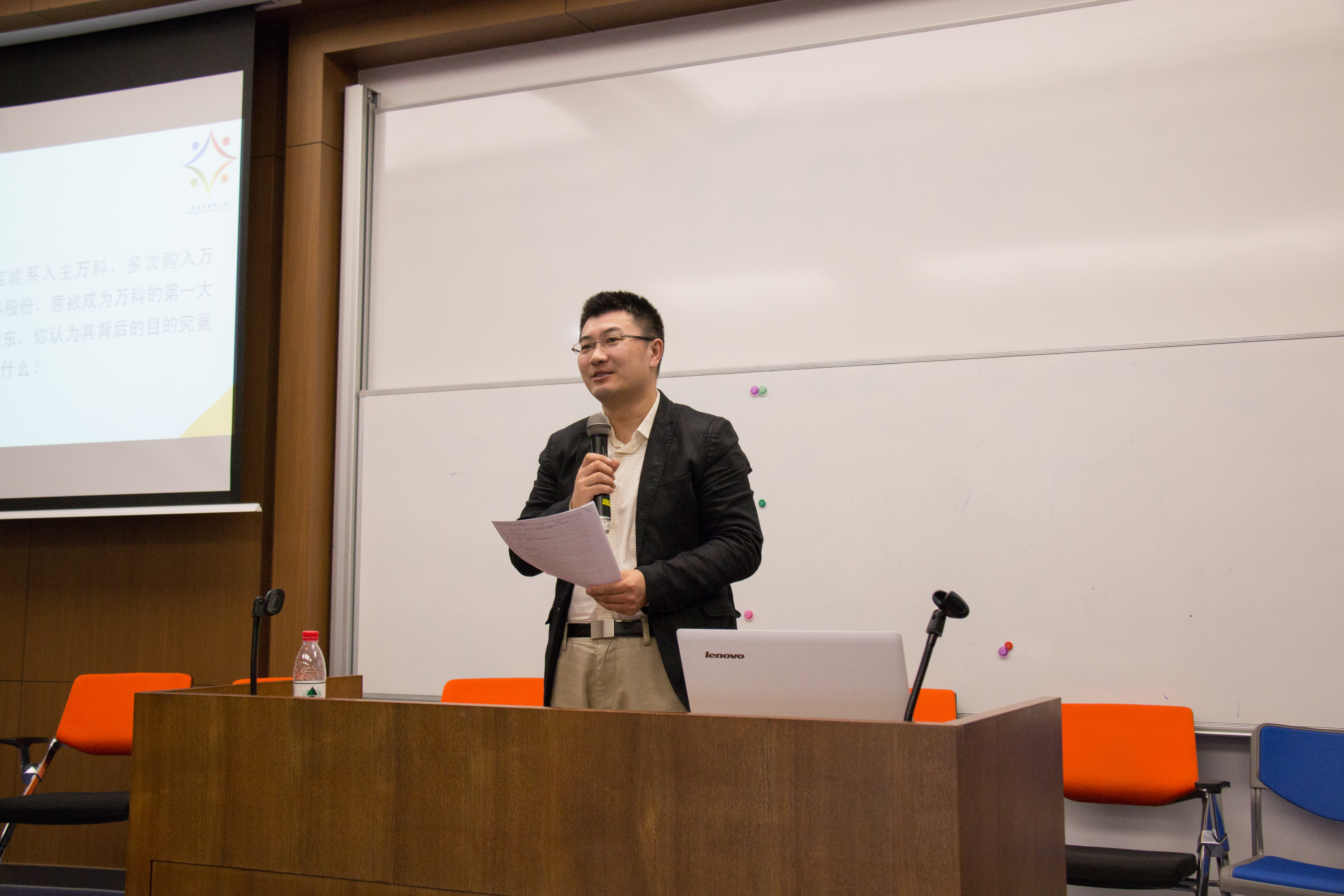 活动开始,几位同学以话剧与旁白结合的形式为大家讲述了万科股权之争的来龙去脉,万科股权之争以宝能系收购万科股份开始,而后上演楚汉之争、三国演义、四国混战,再发展到春秋五霸,股权之争越来越扑朔迷离。同学们分成若干小组对此事进行自由讨论,大家各抒己见、汇聚思想,之后每个小组选派一名代表上台陈述。作为代表的同学们各自持有自己对此事的观点,他们深入的思维能力和清晰的表达能力着实让台下同学们佩服不已。最后,由刘柏老师多角度、多方位地对万科股权之争提出了自己的见解,他不仅总结了之前同学们的发言,还提出了许多独到而深刻的看法,让同学们对此事有了一个更加深入的思考。刘柏老师风趣幽默,让同学在欢快的气氛中学到市场分析的思维方式的同时领略到了大师的魅力。