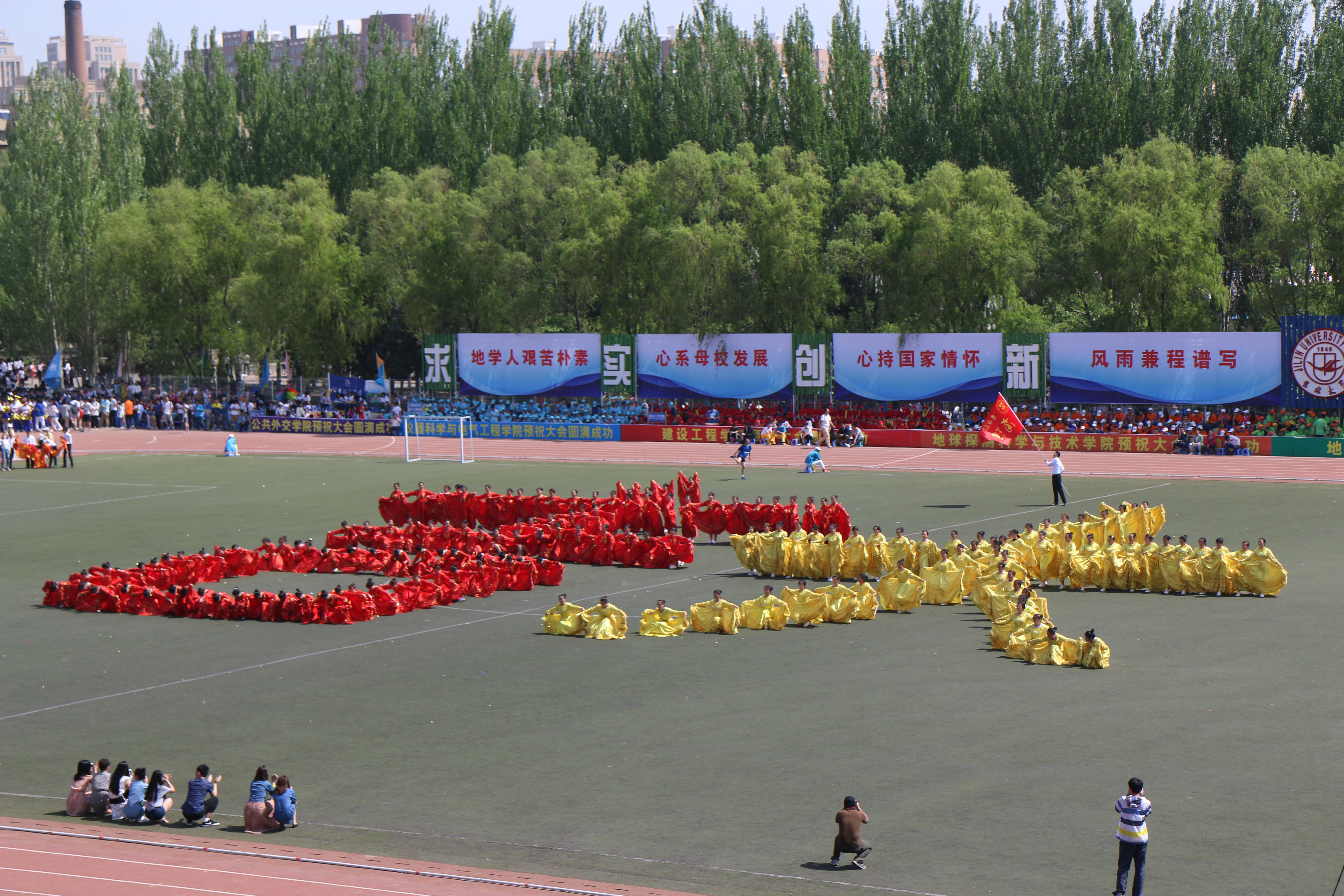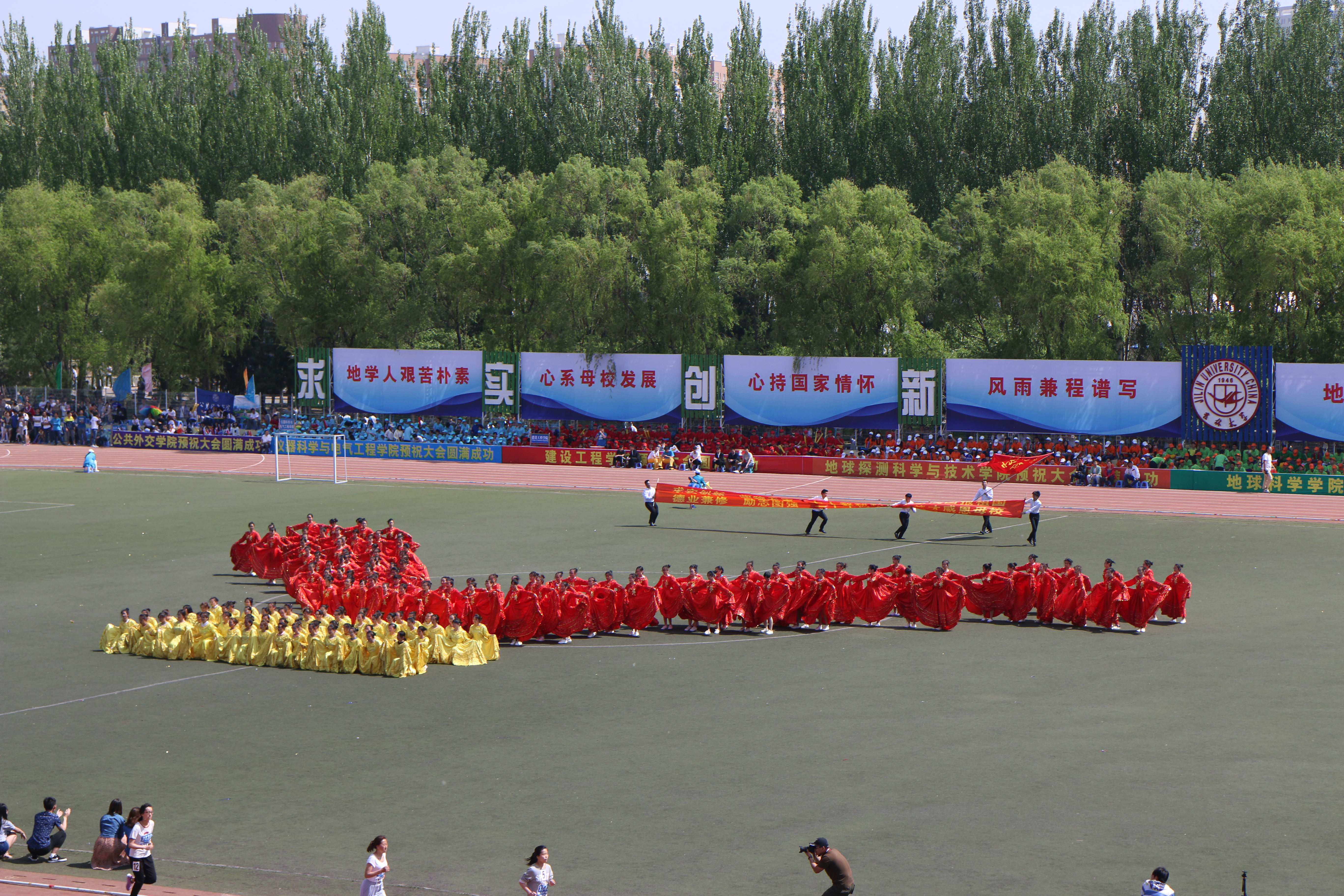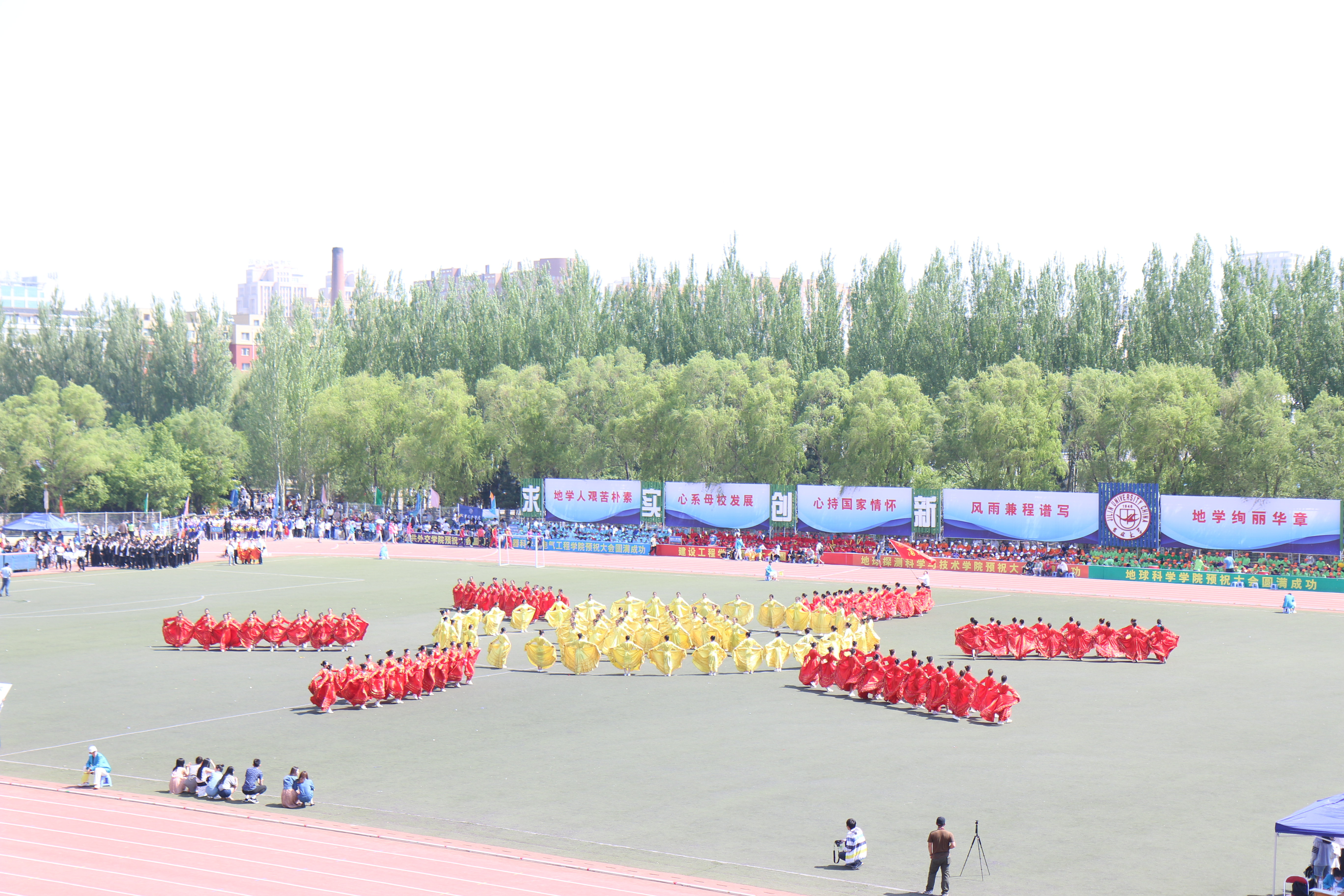 随着音乐逐渐变得高亢激昂,身着红黄长裙的同学在陆地上快速地移动,观看席上的观众们有的屏住呼吸静静观望,有的和身边的人交谈比划,猜测这回是一个怎样的图案,当漂亮的六棱围住中心金黄色的圆圈,草地前讲解的牌子慢慢反过来,“六校”的图案便随着一阵爆发的掌声显示在大家面前。“六校”的红棱有秩有序地旋转着,控制步伐的同学喊哑了嗓子,图形逐渐变化,由红黄长裙摆出的“合并”图案又一次博得了大家的掌声和喝彩。裙摆旋转衣袖飞舞,同学们举手投足演绎着吉大前进的脚步,吉大走过的辉煌。