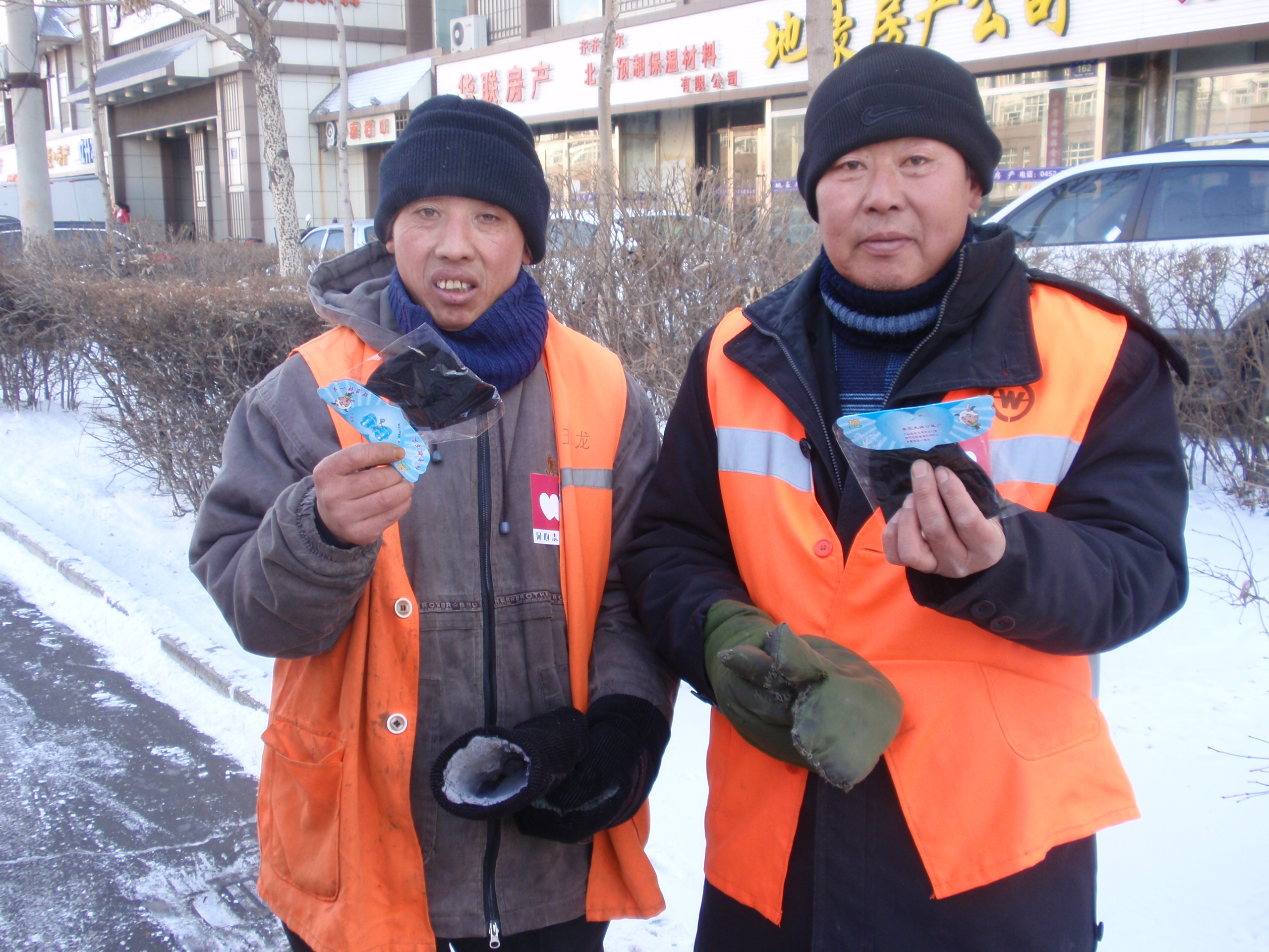 环卫工人的一句句感谢是那么朴实,那么真挚,又那么欣慰,那么幸福,这让志愿者们的脸上也挂满了笑容。望着那一张张被冻得通红的满是皱纹的脸,握着那一双双被冻得僵硬的手,志愿者们关切地送上一句句叮嘱。看着面前这一群一脸认真和关切的年轻人,此时还握着铁锹的他们的眼中装满了感动。也许小小的礼物不能为他们减少多少工作时的辛苦,但我们的这个活动至少让他们感受到了被关注、被关怀的温暖,这也正是这次志愿活动的目的所在。”