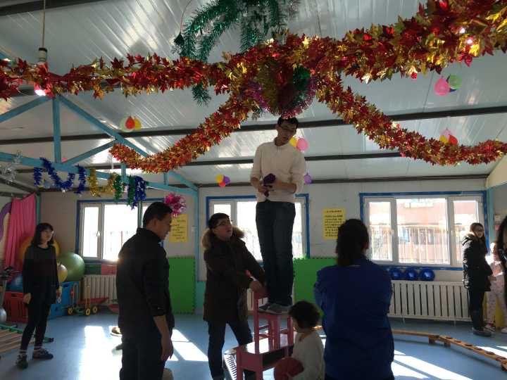 在老师的带领下小组成员进入了小朋友们的教室。那里有五彩缤纷的壁纸,丰富有趣的玩具,还有为了治疗自闭儿童特别准备的器械。男组员们自发地拿起抹布、拖把打扫起来,女孩子们则拉着孩子的手陪伴他们玩耍。有的同学陪小朋友走了一圈又一圈的平衡木而不厌其烦,有的同学跟小朋友拍球充满耐心,还有的同学热情的帮助家长对孩子进行训练。