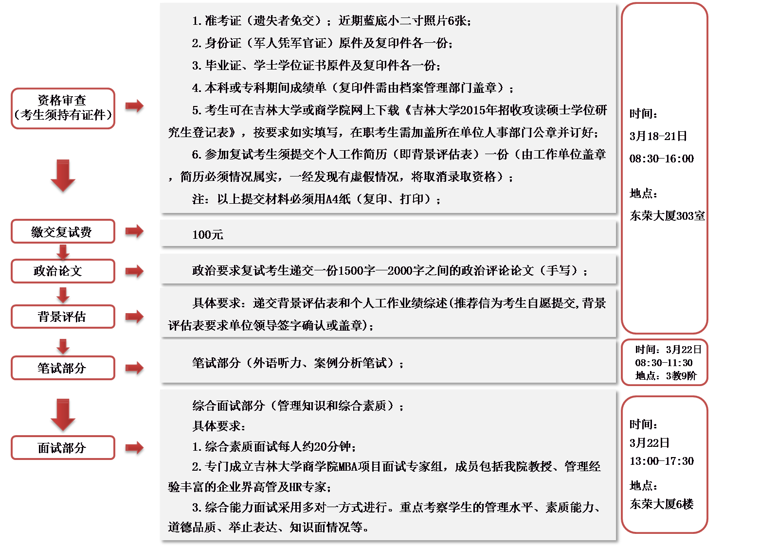 资格审查—缴纳复试费—上交政治论文及背景材料—笔试案例分析—综合面试。