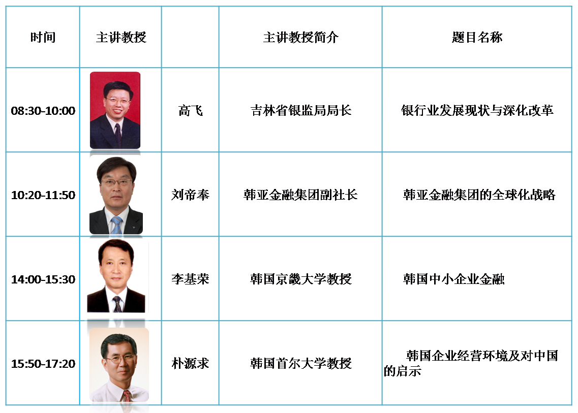由中国·304am永利集团官网与韩国·韩亚金融集团、中国·吉林银行共同主办的中国韩亚·吉林银行金融培训班2016年顺利进入第十一期。现将第十一期中国韩亚·吉林银行金融培训班第二日授课安排公布如下,欢迎各位老师、同学们莅临授课现场!