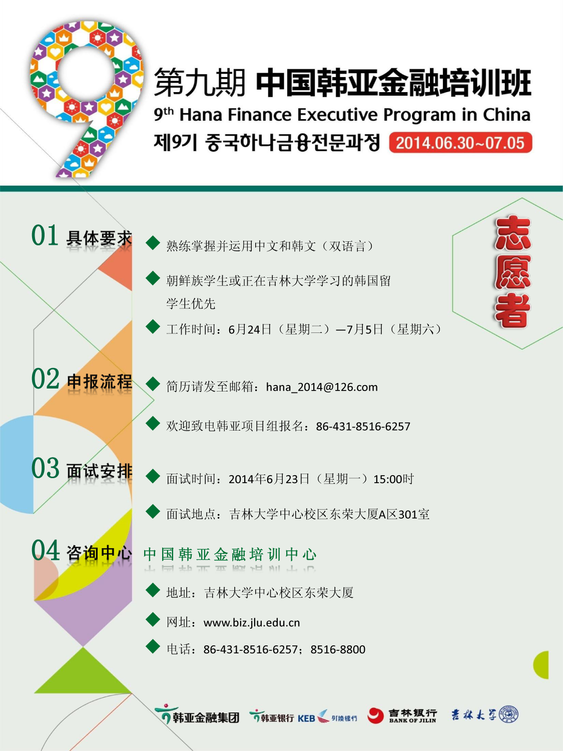 第九期中国韩亚金融培训班将于2014年6月29日正式开始,现面向各位同学招募志愿者。具体要求如下: