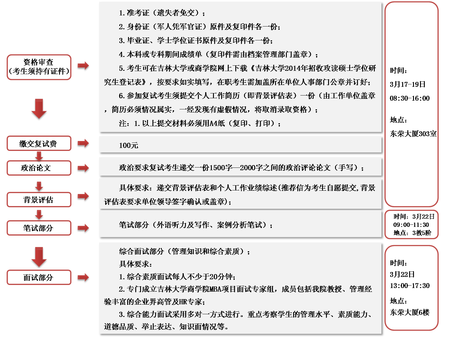 资格审查—缴纳复试费—上交政治论文及背景材料—笔试案例分析—综合面试。