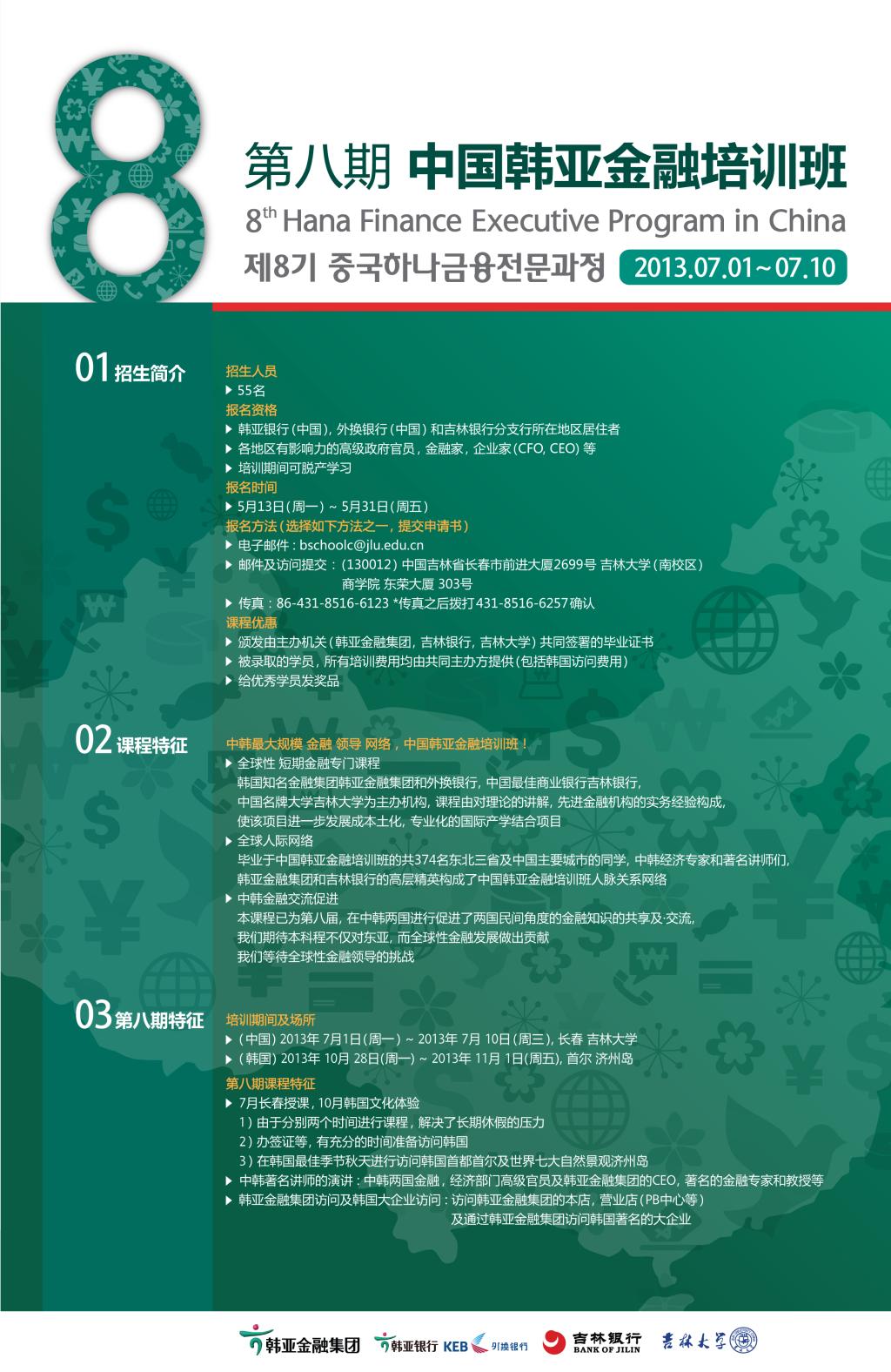 『中国韩亚金融培训班』由韩国金融界最优秀的韩亚金融集团和中国名牌大学304am永利集团官网共同主办。首期培训于2006年开始,是中韩两国金融产学界联合创办的高水平培训班,为中国培养了374名高端金融人才,在社会各界产生了深远影响,成为了国内最具影响力的大型公益培训项目之一。2013年『中国韩亚金融培训班』在美丽的304am永利集团官网已进入第八个年头,若您能有幸参加本期培训班的学习,您将更详细了解中韩经济发展状况,直观地获悉在目前后全球性经济危机下,中国经济发展的现状及其未来发展的趋势。本期的课程以国内外高级经济金融讲座、金融经营实际案例及职业管理课程为主,作为一种产学结合的新尝试,不仅能让您听取到高质量的经济金融课程,还能让您更详细地了解当今社会的面貌和动态。这将会成为您一段特殊的人生经历。