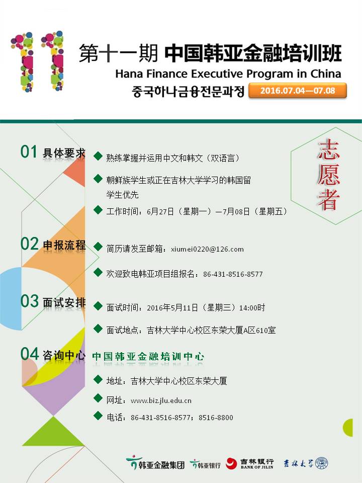 第十一期中国韩亚金融培训班将于2016年7月4日正式开始,现面向各位同学招募志愿者。具体要求如下:
