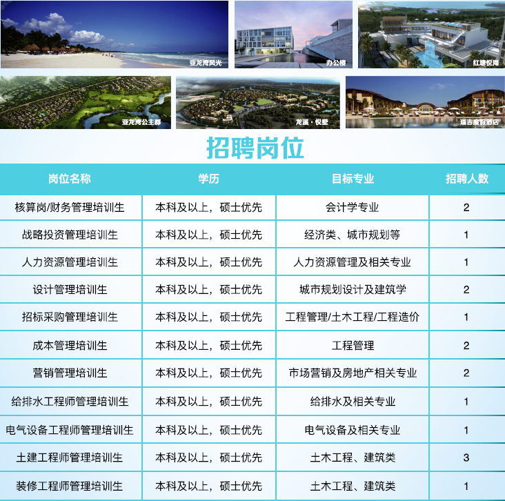 三亚亚龙湾开发股份有限公司(中粮置地·海南公司)系1992年成立的中外合资股份制企业。根据公司业务发展需要,现面向各高等院校公开招聘管理培训生17名,现将有关事项公告如下: